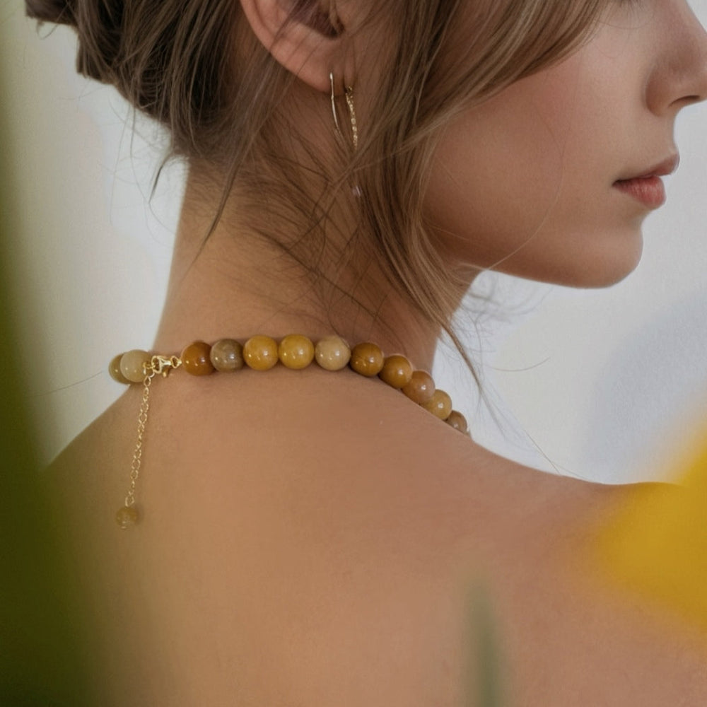 Yellow Aventurine crystal necklace with freshwater pearls and gold accents on a white background. Handmade 6mm gemstone beaded jewelry for confidence and warmth.